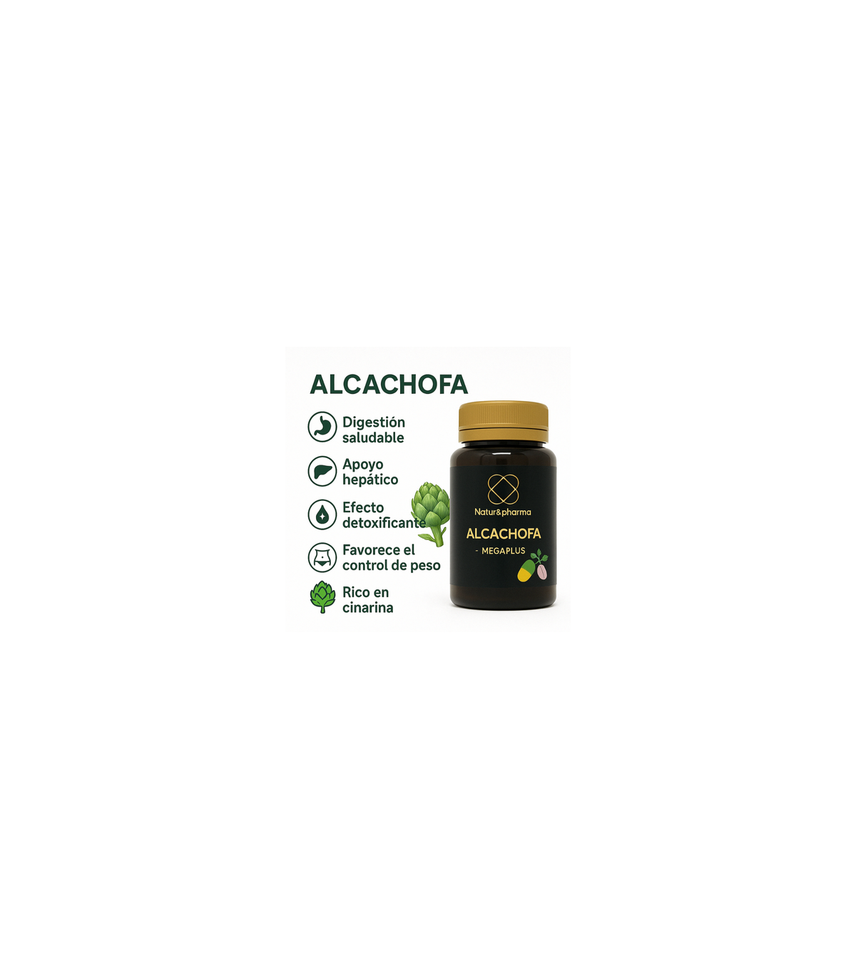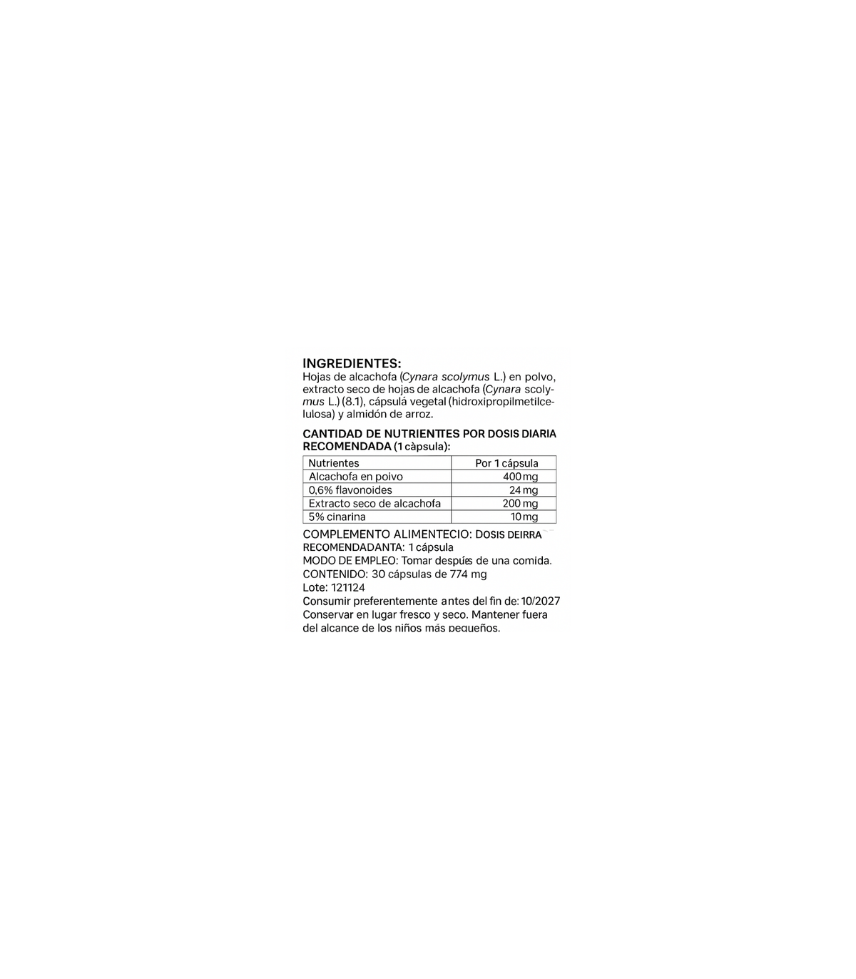 - Extracto de alcachofa (10:1, 5% cinarina): 200 mg