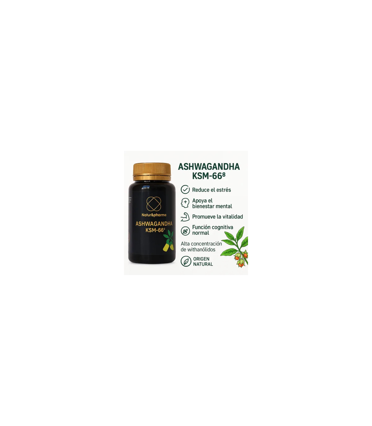 (Withania somnifera), conocida como la raíz de la fuerza, es una planta con propiedades adaptógenas que ha sido empleada en la medicina ayurvédica durante siglos. Su raíz es utilizada para tratar diversos estados de salud, tales como: